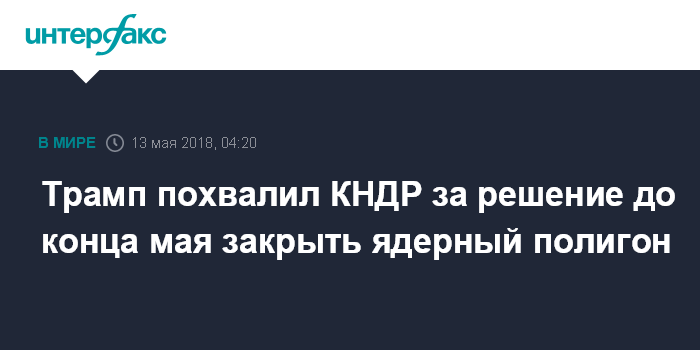 Москва. 13 мая. INTERFAX.RU - Президент США Дональд Трамп высоко оценил решение КНДР до конца мая закрыть полигон для испытаний ядерного оружия Пунгери, назвав это умным и любезным жестом.