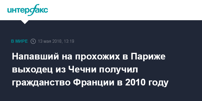Москва. 13 мая. INTERFAX.RU - Мужчина, напавший с ножом на прохожих в центре Парижа в минувшую субботу, был гражданином Франции, он получил гражданство страны в 2010 году, сообщает в воскресенье France Info.