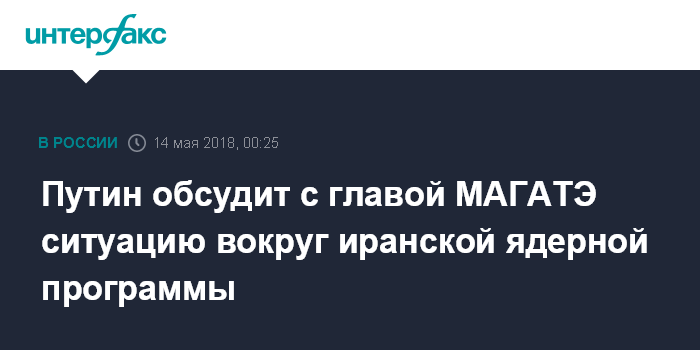 Москва. 14 мая. INTERFAX.RU - Президент РФ Владимир Путин в понедельник в Сочи обсудит ситуацию вокруг иранской ядерной программы с гендиректором МАГАТЭ Юкио Амано. Встреча станет первым мероприятием в международной программе президента РФ, запланированной на понедельник. Затем состоится саммит ЕАЭС, а также двусторонние встречи с лидерами объединения.