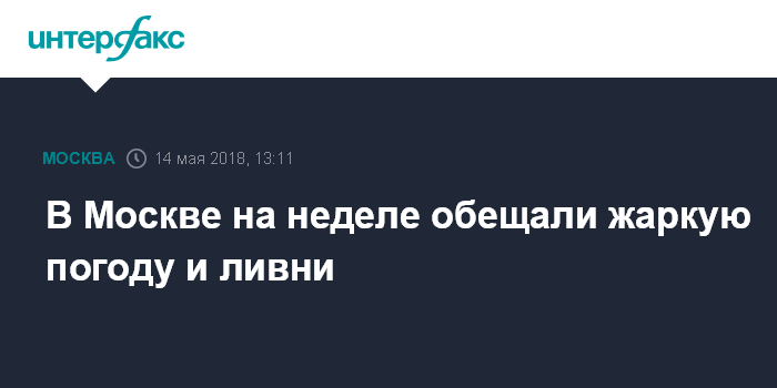 Москва. 14 мая. INTERFAX.RU - По-летнему жаркая погода с грозами ожидается в Московском регионе до конца рабочей недели, выходные начнутся с облачной и дождливой погоды с небольшим похолоданием до +20...+22, заявил "Интерфаксу" глава Гидрометцентра России Роман Вильфанд.