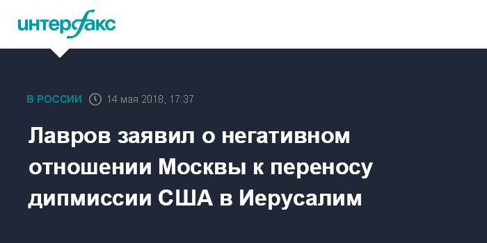 Москва. 14 мая. INTERFAX.RU - Россия негативно относится к переносу посольства США в Иерусалим, заявил и.о. министра иностранных дел РФ Сергей Лавров.