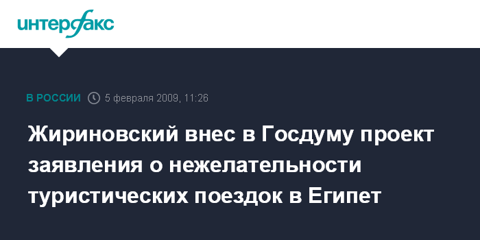 Москва. 5 февраля. INTERFAX.RU - Лидер ЛДПР, вице-спикер Владимир Жириновский предлагает Госдуме официально заявить о нежелательности туристических поездок в Египет.