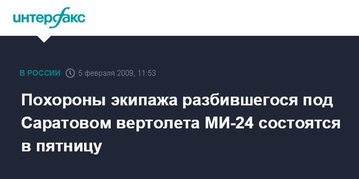 Москва. 5 февраля. INTERFAX.RU - Похороны экипажа вертолета МИ-24, разбившегося во вторник под Саратовом, пройдут в пятницу 6 февраля в городе Пугачев.