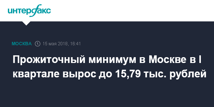Москва. 15 мая. INTERFAX.RU - Величина прожиточного минимума на душу населения в Москве по итогам первого квартала составила 15 786 рублей, что на 389 рублей больше, чем в четвертом квартале 2017 года, следует из проекта постановления правительства столицы, подготовленного департаментом труда и соцзащиты населения.