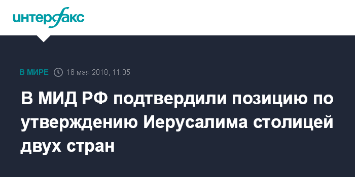 Москва. 16 мая. INTERFAX.RU - В Москве подтверждают позицию о том, что Иерусалим должен стать столицей двух государств, заявила официальный представитель МИД РФ Мария Захарова.