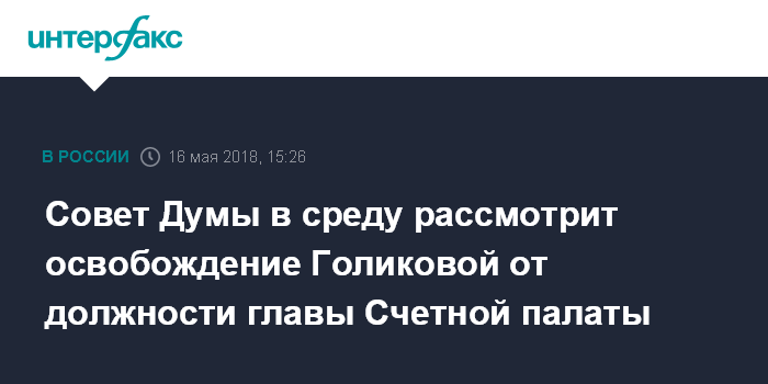 Москва. 16 мая. INTERFAX.RU - Совет Думы на дополнительном заседании в среду рассмотрит представление президента РФ Владимира Путина об освобождении от должности председателя Счетной палаты Татьяны Голиковой, сообщили в пресс-службе Госдумы.
