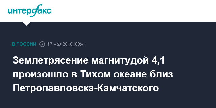 Москва. 17 мая. INTERFAX.RU - Сейсмологи зарегистрировали землетрясение магнитудой 4,1, произошедшее в Тихом океане у берегов полуострова, сообщает в четверг Главное управление МЧС России по Камчатскому краю.