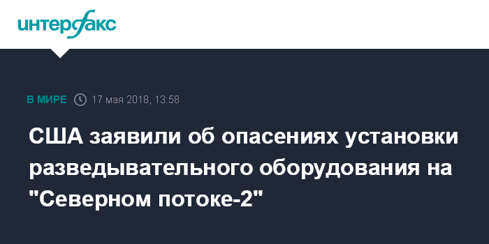Москва. 17 мая. INTERFAX.RU - США опасаются, что Россия установит на маршруте газопровода "Северный поток 2" разведывательное оборудование, передает слова заместителя помощника госсекретаря по энергетической дипломатии Государственного департамента США Сандры Оудкирк агентство Bloomberg.