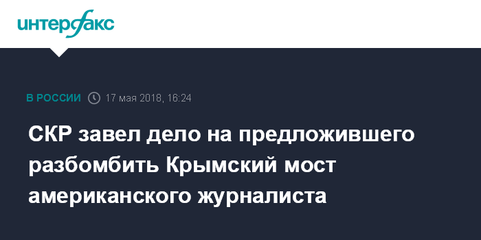 Москва. 17 мая. INTERFAX.RU - Следственный комитет РФ возбудил уголовное дело о призывах к совершению терактов в отношении американского журналиста, написавшего статью с предложением разбомбить Крымский мост, сообщила "Интерфаксу" официальный представитель СКР Светлана Петренко.