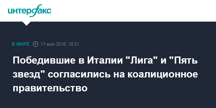 Москва. 17 мая. INTERFAX.RU - Итальянская партия "Лига" и движение "Пять звезд" распространили текст контракта о создании коалиционного соглашения, сообщает в четверг итальянская газета Corriere della Sera со ссылкой на текст документа.