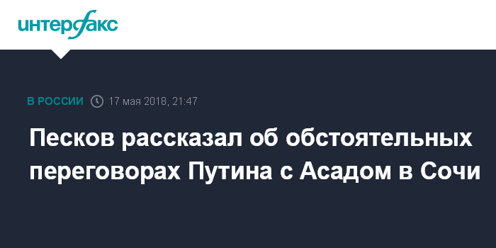 "Сегодня в Сочи состоялись переговоры президента России Путина с президентом сирийско-арабской республики Башаром Асадом. Асад посетил Сочи с рабочим визитом, состоялись достаточно обстоятельные переговоры", - сказал журналистам Песков.