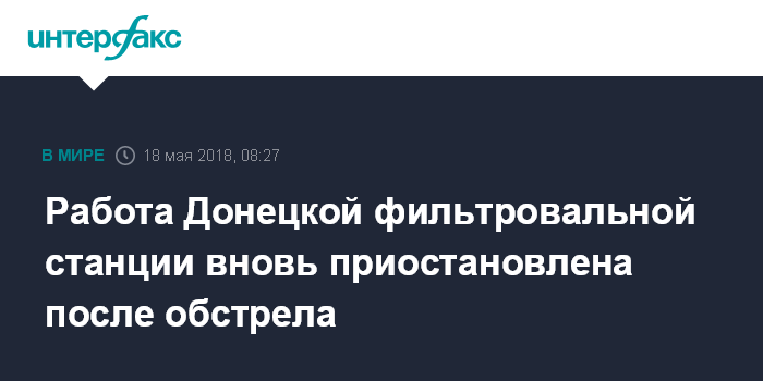 "17 мая около 21:40 в результате обстрела и повреждения электрощитовой в здании реагентного хозяйства приостановлена работа Донецкой фильтровальной станции, которая обеспечивает водоснабжением Авдеевки (около 22 тыс. жителей)", - говорится в сообщении.