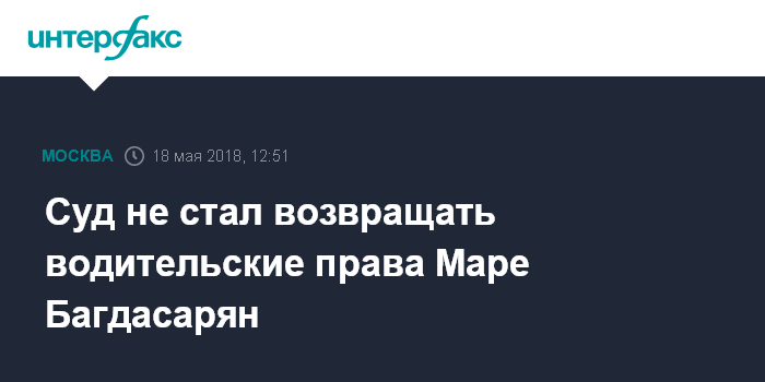 Москва. 18 мая. INTERFAX.RU - Дорогомиловский суд Москвы в пятницу отказал стритрейсерше Маре Багдасарян в возврате ей водительских прав.