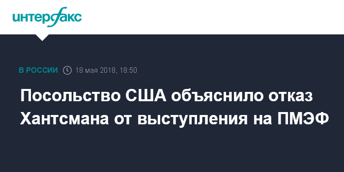 "Изначально посол Хантсман согласился выступить с коротким вступительным словом на панели на тему американо-российского делового климата... Когда стало понятно, что его участие может отвлечь внимание СМИ от важной дискуссии в ходе сессии, посол решил отказаться от вступительного слова", - сказала в пятницу пресс-секретарь посольства США в РФ Андреа Калан.