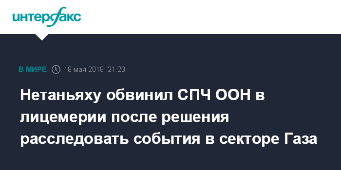 Москва. 18 мая. INTERFAX.RU - Премьер-министр Израиля Биньямин Нетаньяху в пятницу обвинил в лицемерии и пристрастности Совет по правам человека ООН после одобрения резолюции с предложением провести независимое международное расследование столкновений израильских военных и палестинцев в секторе Газа.