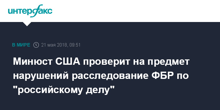 Москва. 21 мая. INTERFAX.RU - Министерство юстиции США организует проверку, чтобы выяснить, не было ли допущено нарушений при проведении расследования ФБР о предполагаемом вмешательстве России в американские выборы 2016 года, сообщает в понедельник канал Fox News.
