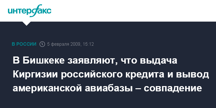 Москва. 5 февраля. INTERFAX.RU – В правительстве Киргизии называют совпадением предоставление Россией льготного кредита республике и решение Бишкека о выводе американской авиабазы.