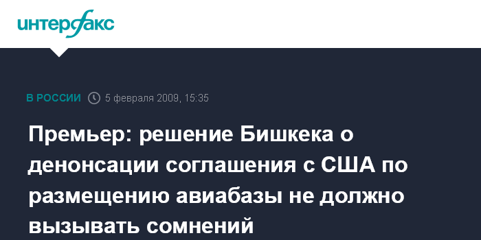 "Правительство приняло постановление о денонсации соглашения с США о размещении авиабазы и передало его в парламент для утверждения. Какие могут быть сомнения в серьезности данного намерения? Этот вопрос будет рассмотрен парламентом в соответствии с регламентом и его решение будет исполнено", - заявил журналистам в четверг премьер-министр Киргизии Игорь Чудинов.