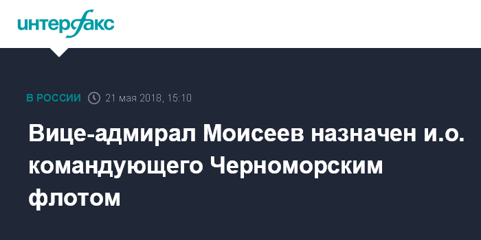 Москва. 21 мая. INTERFAX.RU - Министр обороны России назначил вице-адмирала Александра Моисеева временно исполняющим обязанности командующего Черноморским флотом.