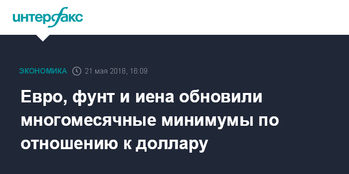 Москва. 21 мая. INTERFAX.RU - Евро, фунт стерлингов и японская иена в ходе торгов в понедельник обновили минимумы по отношению к доллару США на фоне повышения доходности US Treasuries.