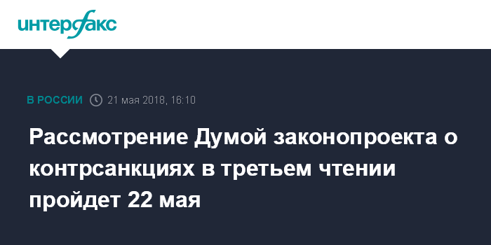 Рассмотрение Думой законопроекта о контрсанкциях в третьем чтении пройдет 22 мая