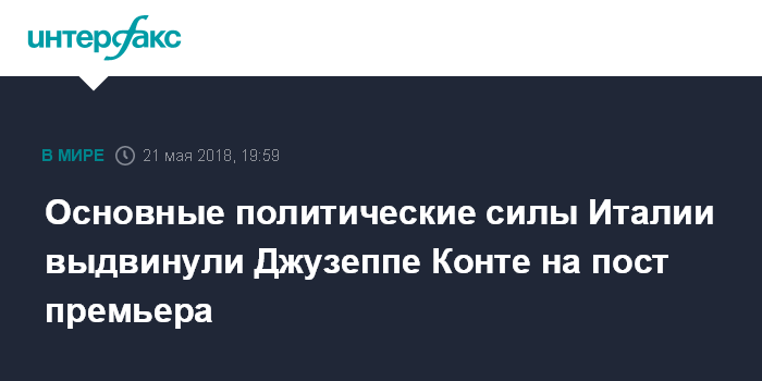 Москва. 21 мая. INTERFAX.RU - Итальянское движение "Пять звезд" и партия "Лига" выдвинули юриста, профессора юриспруденции Флорентийского университета Джузеппе Конте кандидатом на пост председателя Совета министров страны, сообщает итальянская пресса.