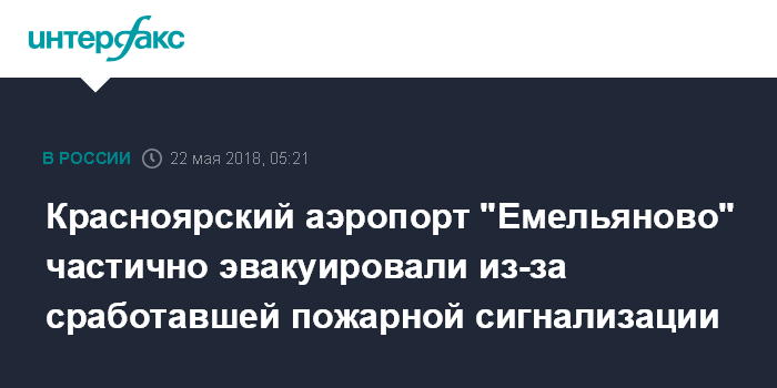 Москва. 22 мая. INTERFAX.RU - Пожарная сигнализация сработала в красноярском аэропорту "Емельяново", сообщил "Интерфаксу" пресс-секретарь воздушной гавани Никита Полеха.