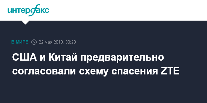 Москва. 22 мая. INTERFAX.RU - США и Китай в общих чертах согласовали схему, которая позволит спасти китайскую телекоммуникационную компанию ZTE, вынужденную прекратить нормальную деятельность из-за американских санкций, сообщает The Wall Street Journal со ссылкой на свои источники.
