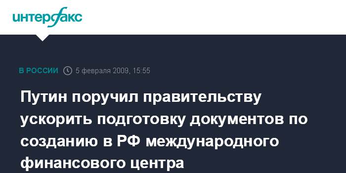Москва. 5 февраля. INTERFAX.RU – Премьер-министр РФ Владимир Путин заявил, что создание в России международного финансового центра - абсолютно реалистичная задача, и поручил правительству ускорить подготовку соответствующих законодательных актов.
