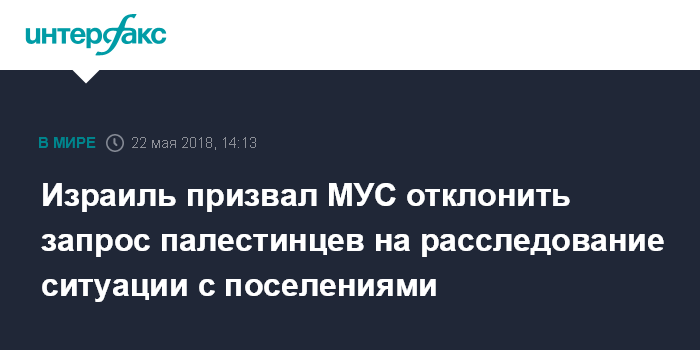 Москва. 22 мая. INTERFAX.RU - Израиль потребовал, чтобы Международный уголовный суд (МУС) отклонил запрос палестинцев на проведение расследования в отношении израильских поселений на палестинских территориях, сообщает во вторник агентство Associated Press.