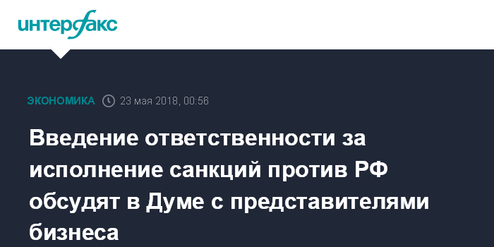 Москва. 23 мая. INTERFAX.RU - Госдума в среду в рамках Совета по законотворчеству обсудит с экспертами и представителями бизнес-сообщества их озабоченности и предложения в связи с законодательной инициативой по введению уголовной ответственности за исполнение на территории РФ иностранных санкций и умышленное содействие их введению.