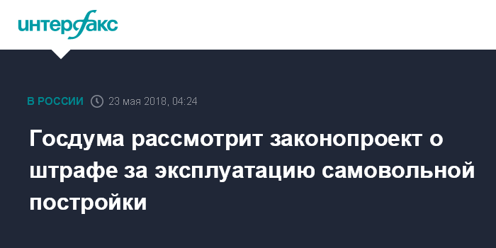Москва. 23 мая. INTERFAX.RU - Госдума на заседании в среду рассмотрит в первом чтении законопроект о введении административного штрафа до 1 млн руб. за эксплуатацию самостроя, и до 300 тыс. за отказ снести самовольную постройку.