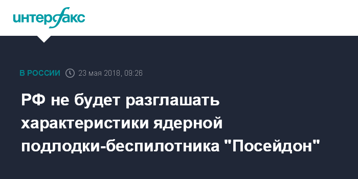 Москва. 23 мая. INTERFAX.RU - Россия не будет предавать широкой огласке характеристики ядерной подлодки-беспилотника "Посейдон", о которой сообщил президент РФ в послании Федеральному собранию, сообщил в интервью "Интерфаксу" глава Объединенной судостроительной корпорации Алексей Рахманов.
