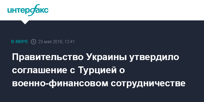 Москва. 23 мая. INTERFAX.RU - Кабинет министров Украины утвердил межправительственное соглашение с Турцией о военно-финансовом сотрудничестве.