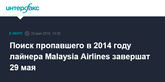Москва. 23 мая. INTERFAX.RU - Поиски пропавшего с радаров в 2014 году авиалайнера MH370 авиакомпании Malaysia Airlines будут завершены 29 мая, сообщает в среду сайт Channel NewsAsia со ссылкой на министра транспорта Малайзии Энтони Лока.