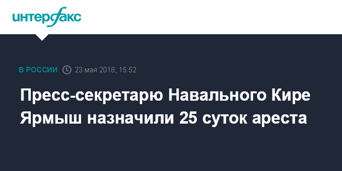 Москва. 23 мая. INTERFAX.RU - Тверской суд Москвы назначил 25 суток административного ареста пресс-секретарю оппозиционера Алексея Навального Кире Ярмыш за нарушение порядка организации протестной акции в центре столицы 5 мая.