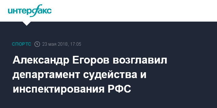 Москва. 23 мая. INTERFAX.RU - Российский футбольный союз объявил о назначении Александра Егорова на пост руководителя департамента судейства и инспектирования РФС.