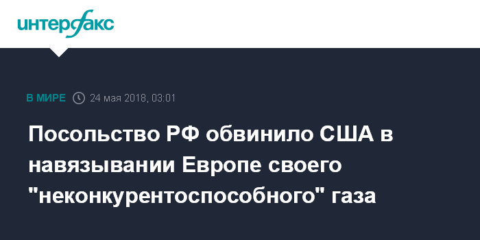 "Атакуя "Северный поток - 2", Вашингтон навязывает Европе свой неконкурентоспособный сжиженный природный газ. Геополитика опять самым откровенным образом вмешивается в экономику, дискредитирует лозунги о диверсификации поставок", - говорится в тексте, размещенном в четверг в фейсбуке диппредставительства.
