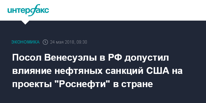 Москва. 24 мая. INTERFAX.RU - Посол Венесуэлы в России Карлос Рафаэль Фариа Тортоса допускает, что нефтяные санкции США в отношении его страны могут сказаться на проектах "Роснефти" в Венесуэле.