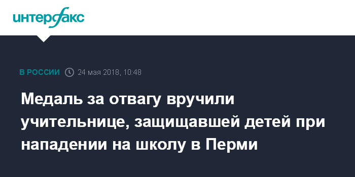 Москва. 24 мая. INTERFAX.RU - Губернатор Пермского края Максим Решетников на пленарном заседании регионального Законодательного собрания в четверг вручил медаль "За отвагу" учительнице пермской школы №127 Наталье Шагулиной, которая пострадала при нападении двух подростков на учебное заведение, передал корреспондент "Интерфакс" с места события.
