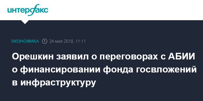 Москва. 24 мая. INTERFAX.RU - В новый фонд госвложений в инфраструктуру будут привлекаться, в том числе, средства международных банков, финансирующих инфраструктурные проекты, - в частности, идут переговоры с Азиатским банком инфраструктурных инвестиций (АБИИ), сказал глава Минэкономразвития РФ Максим Орешкин журналистам в кулуарах Петербургского международного экономического форума (ПМЭФ-2018).