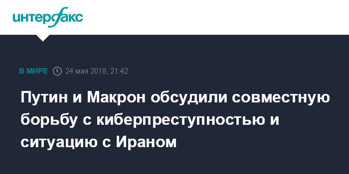 Москва. 24 мая. INTERFAX.RU - Президент РФ Владимир Путин сообщил, что на переговорах со своим французским коллегой Эмманюэлем Макроном в четверг обсудил вопросы борьбы с киберпреступностью.