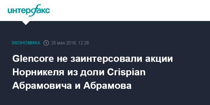 Москва. 25 мая. INTERFAX.RU - Трейдер Glencore не интересуется приобретением пакета акций "Норильского никеля" у Crispian Романа Абрамовича и Александра Абрамова, заявил "Интерфаксу" высокопоставленный источник, знакомый с позицией Glencore.