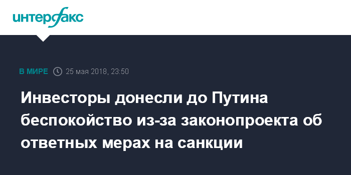 Москва. 25 мая. INTERFAX.RU - Руководители иностранных компаний на встрече с Владимиром Путиным, которая завершала пятничную программу президента РФ на Петербургском международном экономическом форуме (ПМЭФ-2018), выразили обеспокоенность законопроектом об ответственности за соблюдение антироссийских санкций.