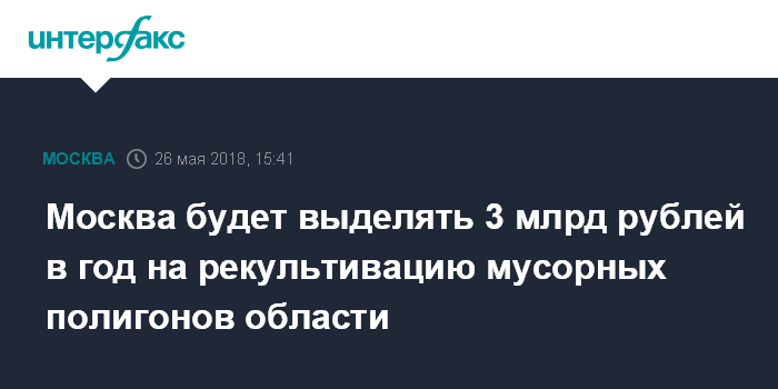 Москва. 26 мая. INTERFAX.RU - Власти Москвы каждый год будут предоставлять порядка 3 млрд рублей Московской области на рекультивацию полигонов твердых бытовых отходов, заявил мэр столицы Сергей Собянин.