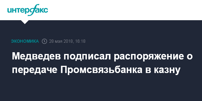 Москва. 28 мая. INTERFAX.RU - Премьер-министр РФ Дмитрий Медведев подписал распоряжение о передаче Агентством по страхованию вкладов (АСВ) в казну акций Промсвязьбанка на 113,4 млрд рублей, говорится в сообщении пресс-службы правительства РФ.