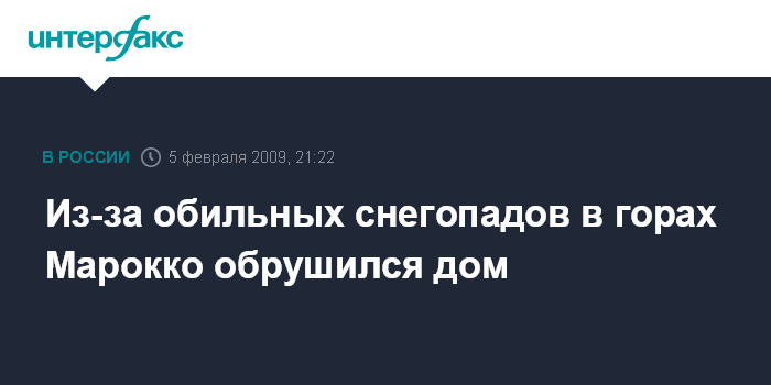 Йоханнесбург. 5 февраля. INTERFAX.RU - Не менее шести человек погибли в четверг в результате обрушения дома в горах Атлас в Марокко, сообщает южноафриканский информационный канал News-24". По его данным, обрушение дома произошло из-за обильных снегопадов.