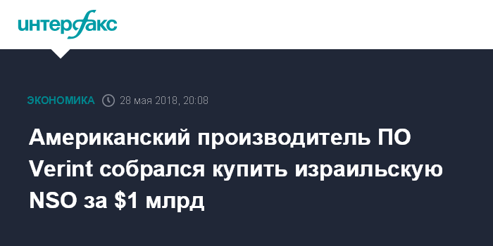 Москва. 28 мая. INTERFAX.RU - Американский разработчик программного обеспечения Verint Systems ведет переговоры о приобретении израильской NSO Group, выпускающей программы и оборудование для кибершпионажа, пишет The Wall Street Journal со ссылкой на информированные источники.