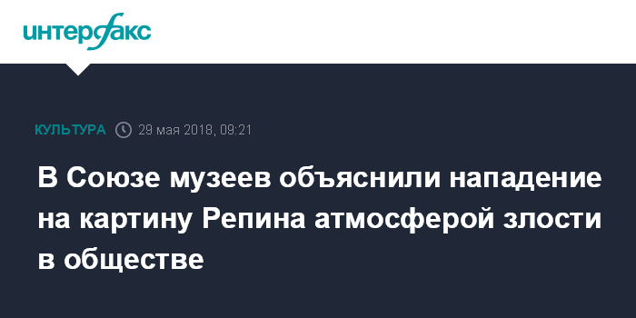Москва. 29 мая. INTERFAX.RU - В Союзе музеев нападение на картину Ильи Репина в Третьяковке считают результатом атмосферы нетерпимости в обществе, уроки произошедшего будут обсуждаться 31 мая на Общем собрании организации.
