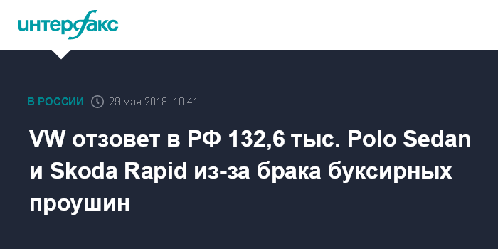 Москва. 29 мая. INTERFAX.RU - Российское подразделение немецкого автоконцерна Volkswagen AG ООО "Фольксваген Груп Рус" отзывает в РФ 132,605 тыс. автомобилей Volkswagen Polo Sedan и Skoda Rapid.